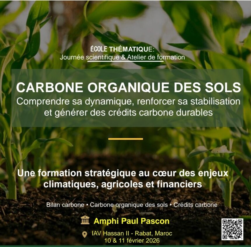 يستضيف معهد الحسن الثاني للزراعة والبيطرة يومي 10 و11 فبراير 2026 الدورة الخامسة للمدرسة الموضوعاتية المنعقدة تحت عنوان “الكربون العضوي في التربة: فهم ديناميته، تعزيز استقراره، وإنتاج أرصدة كربونية مستدامة”. يهدف الحدث إلى مناقشة أهمية الكربون العضوي في تحسين جودة التربة الزراعية ودوره في التخفيف من التغيرات المناخية المتزايدة.